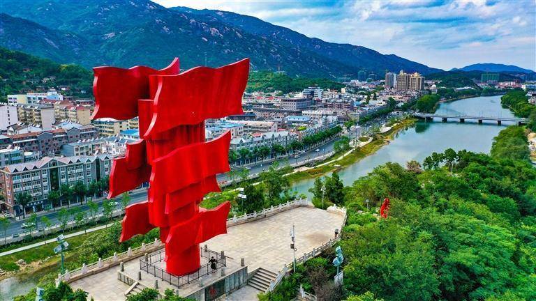图① 新县英雄山上的 “红旗飘飘”雕塑巍峨耸立。本报记者 聂冬晗 摄(资料图片)